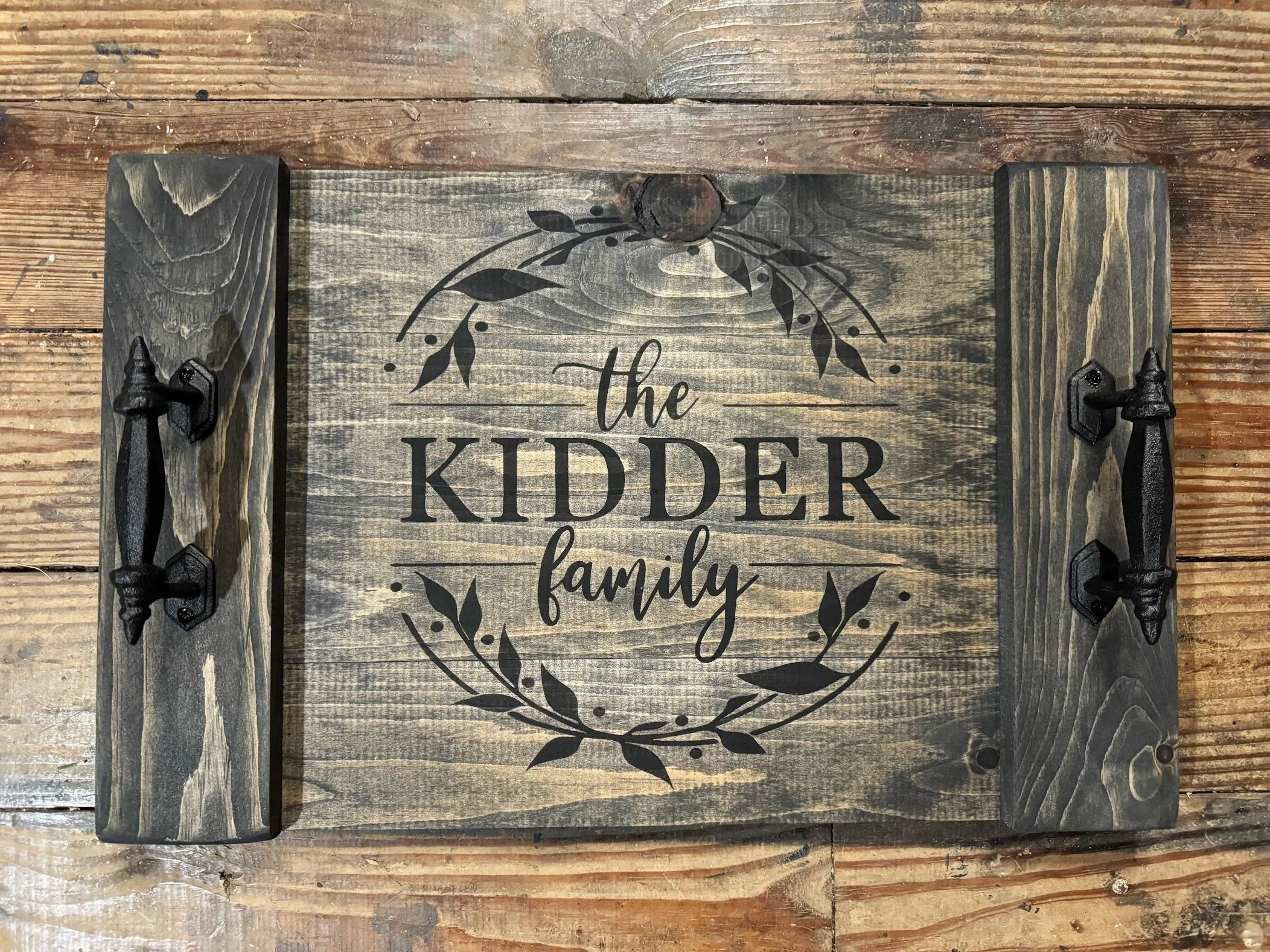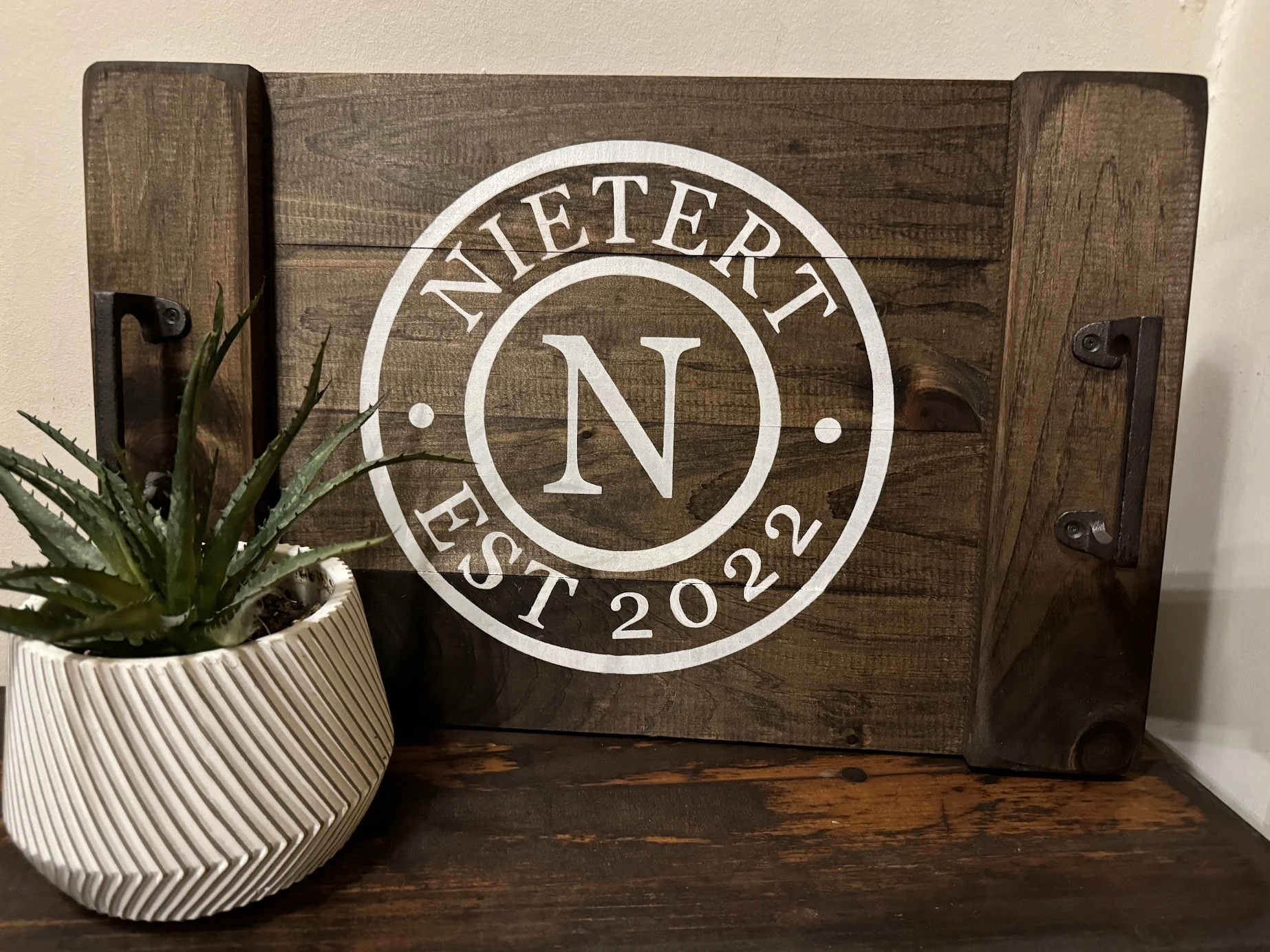 Our medium tray is built with Ohio white pine boards, each tray is 22”x 14” and hand made from start to finish. Comes with a flush cut keyhole in the back that allows it to be hung on a wall or lay flat on any surface. The wrought iron handles complete the look, making it a conversation piece for any home.